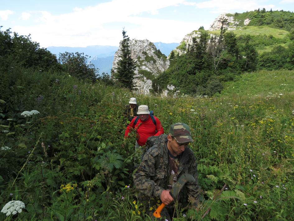КГПБЗ. Значительную часть этого пути пришлось буквально прорубаться сквозь субальпийскую растительность (рис. 19) или двигаться по следам медведей, выходившим к начинающим созревать малинникам.